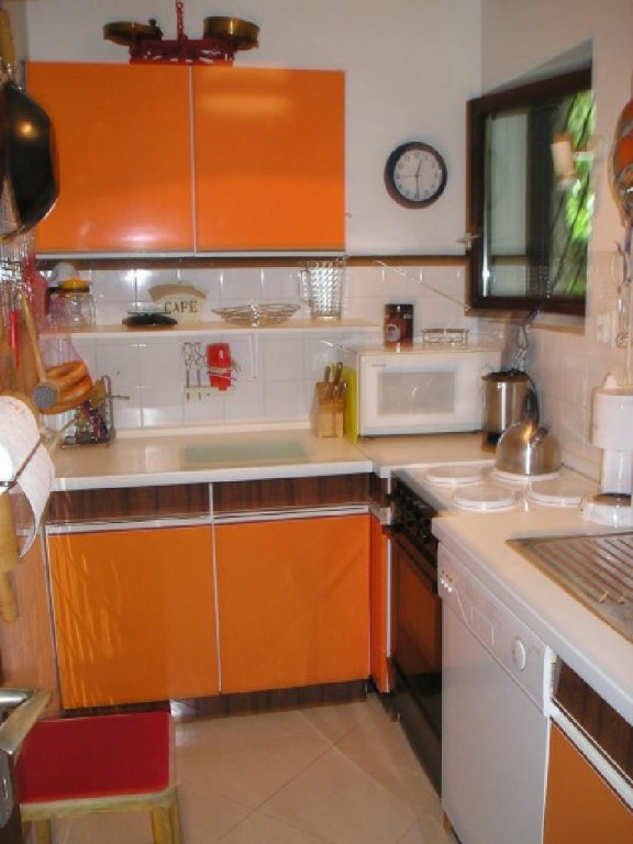 komplett eingerichtete Küche, ein separates WC, eine schöne Terrasse in Grün.